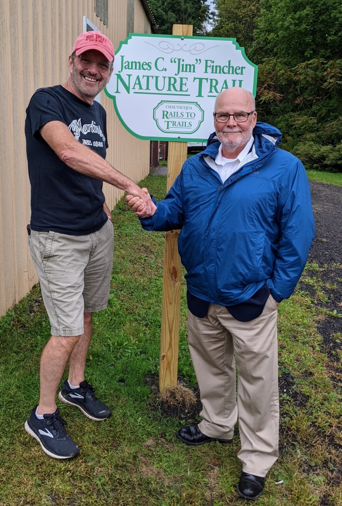 Highlights of the meeting included installation of officers for the next year and the induction of one new board member. The Signage subcommittee reported on its latest achievements, one of which was the creation and erecting of the James C. “Jim” Fincher Nature Trail sign. Other agenda items included updates on the ongoing efforts of Patrick Johnson to realize the dream of making the rail trail viable between Sherman and Clymer, plans for needed repairs to the “Swank” culvert on the Ney Trail, progress on the Town of Carroll Trail in Frewsburg, recognition of volunteer mowers, edits to the trail guide, improvements to the entrance segment of the Webb Trail at Rt. 394 and an update on the large problematic culvert near Woleben Road and funding for its much needed repair.